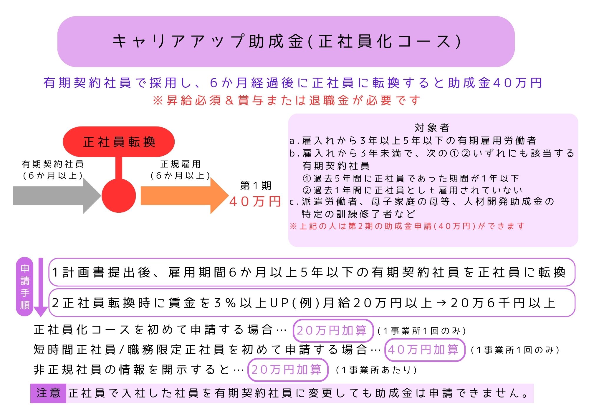 - お給料のアップ 正社員になった後の6ヶ月間の給料を、正社員になる前の6ヶ月間と比べて**「3%以上」アップ**させる必要があります。
