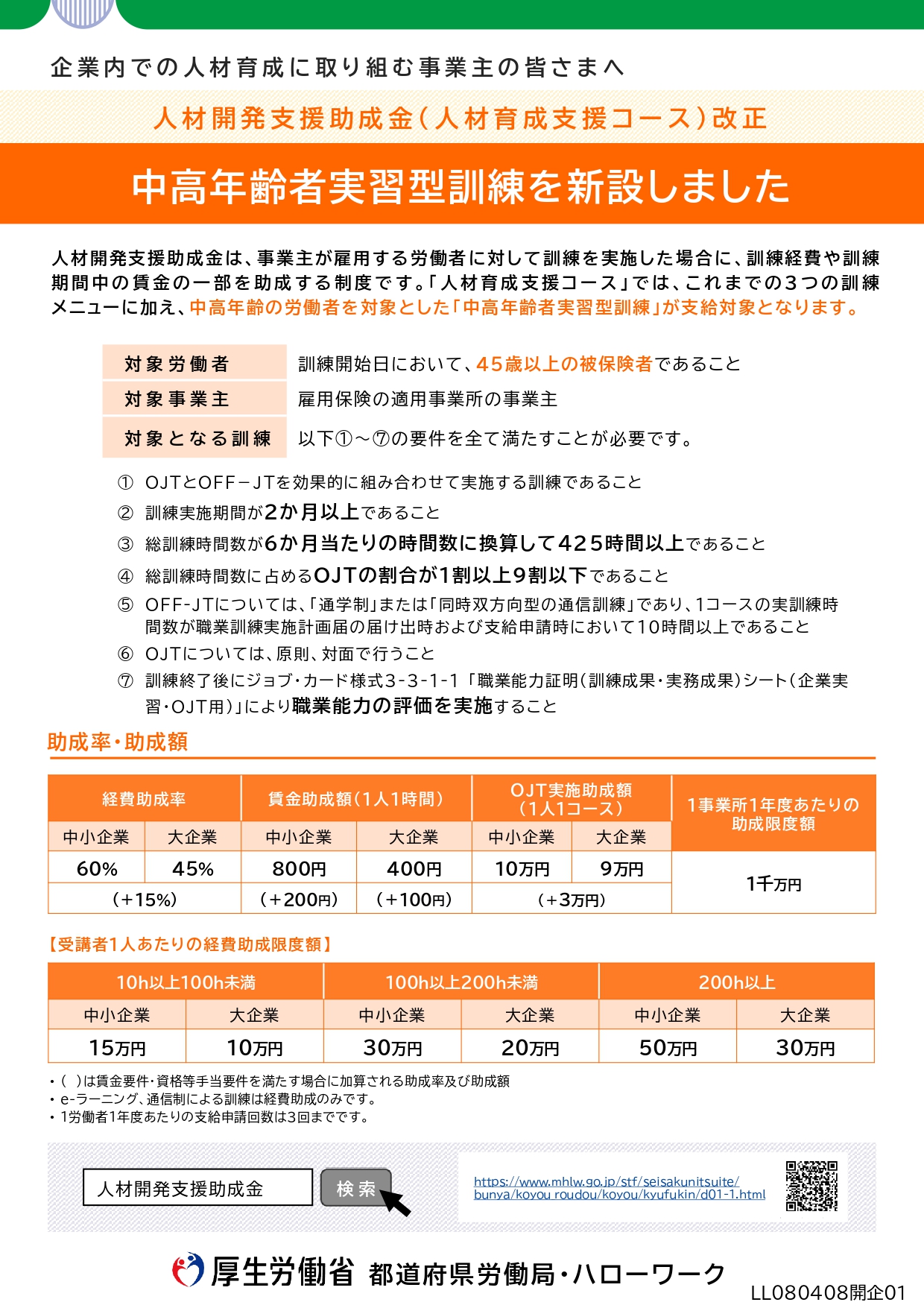 45歳以上のベテラン社員を対象に、新たな実践的スキルを身につけてもらうための、現場での実務研修+座学研修