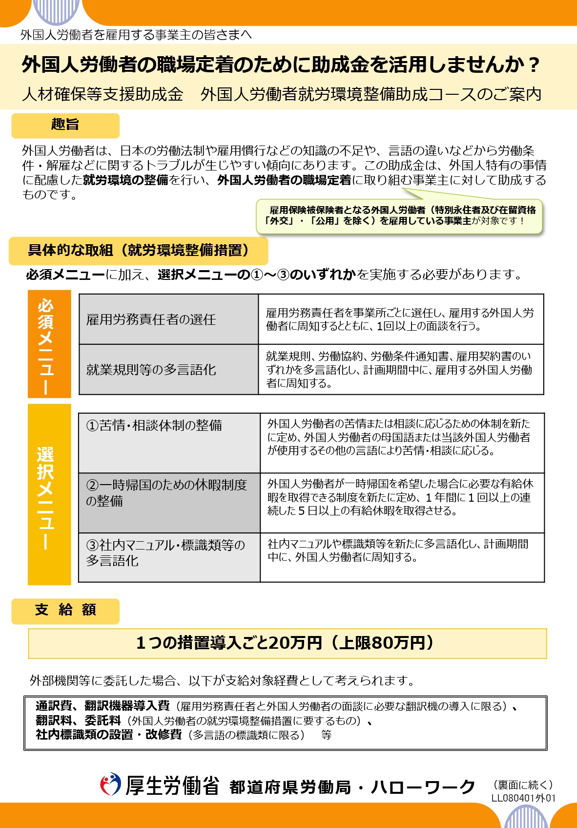 就業規則や雇用契約書などを、外国人スタッフの母国語や「やさしい日本語」に翻訳して配ります。 - 【どれか1つ以上を選ぶこと(選択)】